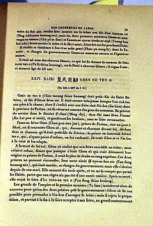 Titsingh's translation was eventually published in Paris in 1834 under the title Annales des empereurs du Japon.[9] The 1834 printing incorporates a slim "supplement" with material which post-dates Titsingh's departure from Japan in 1784. This additional section of the book was not the product of translation, but must have been informed by oral accounts or correspondence with Japanese friends or European colleagues still in Japan.[6]