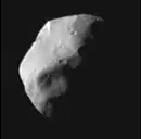 The New Horizons spacecraft visited the Pluto system and photographed Pluto and its moons during its flyby on 14 July 2015. Of Pluto's smaller moons, only Nix and Hydra were imaged at resolutions high enough for surface features to be visible.[23] Prior to the flyby of the Pluto system, measurements of Nix's size were performed by the Long Range Reconnaissance Imager on board New Horizons, initially estimating Nix to be about 35 km (22 mi) in diameter.[32] The first detailed images of Nix taken by New Horizons from a distance of about 231,000 km (144,000 mi) were downlinked, or received from the spacecraft on 18 July 2015 and released to the public on 21 July 2015.[25] With an image resolution 3 km (1.9 mi) per pixel, Nix's shape was often referred to as a "jelly bean" shape.[25] Enhanced color images from the Ralph MVIC instrument of New Horizons show a reddish region on its surface.[25] From those images, another accurate measurement of Nix's dimensions was made, giving the approximate dimensions of 42 km × 36 km (26 mi × 22 mi).[25]