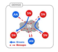 NoTA device consists of Service Nodes (SN) and Application Nodes (AN) that communicate through logical Interconnect (IN). IN provides two basic means of communication, namely message based and streaming type. The former is bi-directional and used for Service Messages. The latter one is uni-directional and used for large amounts of data like media content. Service Nodes have unique Service Identifier (SID).