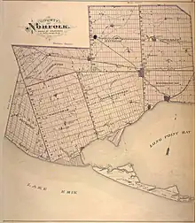 In 1826, the townships of Rainham and Walpole were moved to Haldimand County in Niagara District because of their distance from the London courthouse.[17] Walsingham was originally one township, but had been split into North and South Walsingham in 1881.