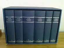 A preliminary wordlist issued by Riksmaalsvernet in March 1921 led to a fierce linguistics debate in newspapers and in the cultural and literary magazine Samtiden.[2][4][5][6] In 1922 Alf Sommerfelt was appointed as editor for the dictionary.[7] Trygve Knudsen joined the work in 1924, and was co-editor for the project from July 1925.[3][8] Harald Noreng joined as secretary in 1938, and as co-editor from 1940.[9][10] The dictionary was issued in parts, starting from 1930, and the work was completed in 1957, and printed in four volumes.[3][8][11] From 1981, the Norwegian Academy for Language and Literature has been responsible for the dictionary.[12] A reprint of the four volumes was issued in 1983, and again in 1991.[10][12]
