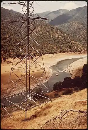 An extensive hydroelectric system is located along the North Fork. Below the Wishon Dam the North Fork flows through a gorge with a massive drop in elevation and is used to generate conventional hydroelectricity at two stations along its course. A 6-mile (9.7 km) tunnel from Wishon Reservoir carries water to the 128 megawatt underground Haas Powerhouse, where the water drops 850 feet (260 m) to power the turbines.[6] Black Rock Reservoir serves as the afterbay for the Haas Powerhouse and forebay for Balch Powerhouse, located another 3 miles (4.8 km) downstream. Below that is the Kings River Powerhouse, which discharges water directly into Pine Flat Lake.