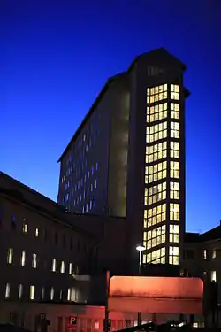 The North Karelia Central Hospital (Finnish: Pohjois-Karjalan keskussairaala) is a hospital located in the city of Joensuu in North Karelia, Finland. It was built in 1953, which makes it the oldest central hospital in the whole country.[1][2] The hospital is located near the city center of Joensuu on the top of Niinivaara, from where its white main building can be seen tens of kilometers all the way to Koli. The height of the 12-storey building is 45 meters.[3] Architects Jussi Paatela together with Olli Pöyry and Marja Pöyry were responsible for the design of the hospital buildings.[4]