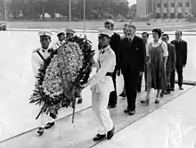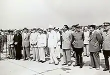 Supervision of the implementation of the Geneva Accords was the responsibility of an international commission consisting of India, Canada, and Poland, respectively representing the non-aligned, the capitalist, and the communist blocs. The United States, which did not sign the Geneva Accords, stated that it "shall continue to seek to achieve unity through free elections supervised by the United Nations to ensure that they are conducted fairly".[14] Meanwhile, the State of Vietnam strongly opposed the partition of the country,[15] with its prime minister Ngô Đình Diệm announcing in July 1955 that the State of Vietnam would not participate in elections, claiming that it had not signed the Geneva Accords and was therefore not bound by it,[16] and raising concerns that an unfree election would occur under the Việt Minh regime in North Vietnam.[15] In October 1955, Diệm's government held its own referendum, which was widely marred by electoral fraud, to depose Chief of State Bảo Đại and established the Republic of Vietnam with Diệm as its first president.[17][18]