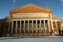 Conceptualized as far back as 1908, it was built as part of a major University expansion project, and was designed to host the university's entire student population in 1929. The auditorium was dedicated to honor Cyrus Northrop, the second president of the university, and veterans who served in World War I.[29] Northrop's opening ceremonies included performances by the Minnesota Orchestra, the Boston Symphony, and the "Alumni and State Program". A pipe organ, the largest in the Upper Midwest, was installed in 1936,[30] but later removed in 2011, during an extensive renovation of the building, which reduced seating, but improved sight lines and acoustics in the main theater, and saw a second theater space added on the fourth floor.[31] The building reopened in 2014[32] and the pipe organ was reinstalled three years later, in 2017.
