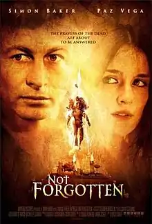 Not Forgotten is a 2009 American independent horror thriller written and directed by Dror Soref starring Simon Baker and Paz Vega. The film takes place on the Texas-Mexico border and tells the story of a kidnapping plot involving the ritualistic cult Santa Muerte. The protagonist Jack Bishop's (Simon Baker) dark past is slowly uncovered as the kidnapping case unravels.[2]