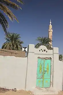 Modern Nubian architecture in Sudan is distinctive, and typically features a large courtyard surrounded by a high wall. A large, ornately decorated gate, preferably facing the Nile, dominates the property. Brightly colored stucco is often decorated with symbols connected with the family inside, or popular motifs such as geometric patterns, palm trees, or the evil eye that wards away bad luck.[60]