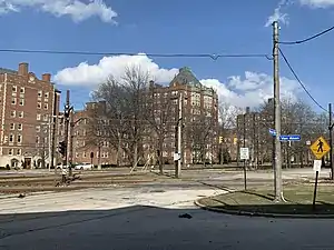 SR 87 begins at Public Square in Cleveland, at an intersection with US 6 / US 42 / SR 3. It is concurrent with US 422 and SR 8 for just over 2 miles (3.2 km) (as well as SR 14 and SR 43 for a short segment), and then leaves the concurrency to occupy a section of Woodland Avenue. The route heads eastward and becomes Buckeye Road, and then Shaker Boulevard, which is a divided boulevard with RTA commuter rail tracks (the "Rapid") between the east- and westbound lanes as it travels through Shaker Heights.[2]