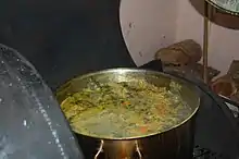 Oil down is a stew of breadfruit, salted meat, chicken, dumplings, callaloo, and other vegetables stewed in coconut milk, herbs, and spices.[2][3] The name refers to the fact that the oil from the coconut milk used in cooking is either absorbed by the ingredients or settles to the bottom of the cooking pot.[4] All of the liquid is cooked down (dried out), hence the name oil down.[5]