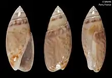 Olivella mandarina is a species of small sea snail, marine gastropod mollusk in the subfamily Olivellinae, in the family Olividae, the olives. Species in the genus Olivella are commonly called dwarf olives.[2]