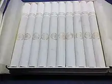 The formal Onshino Tabako system was started in 1933. During the war years, it was included in the supplies of the army and navy, each order prepared by hand. The special cigarettes were even mentioned in a war song called "Sorano Yūshi" (Brave Men of the Skies) in 1939 which portrayed the Battles of Khalkhin Gol. On the packaging of Onshino Tabako was printed a character: 賜, meaning "gift from a noble man,"[6] and the chrysanthemum crest was on every cigarette. The taste of Onshino Tabako was reportedly the same as other cigarettes. According to some men who had tasted it, it was bitter, as opposed to sweet.[7] It was not sold on the market, and was exclusively given to decorated persons, attendants at Imperial parties, visitors to and volunteers of the Imperial House of Japan, and security men of the Imperial Household. The production of special tobacco for the relatives of Emperor Shōwa was discontinued by the order of the General Headquarters of Japan of the allied forces in 1945. However, Onshino Tobako as gifts continued to be produced.
