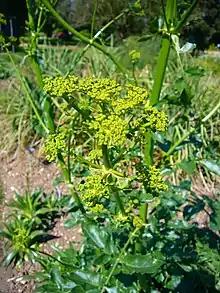 The genus name Opopanax derives from Anglo-Norman opopanac, from Latin opopanax, from Hellenistic Greek ὀποπάναξ, from Ancient Greek ὀπός (opos, "juice") + πάναξ (panax, "all-healing").[2] Therefore, opopanax literally means the juice (gum resin) of all-heal. There were many different plants called all-heal (πάνακες or panaces) in Ancient Greece and Rome. However, according to Dioscorides, opopanax was obtained specifically from a kind of all-heal named πάνακες Ἡράκλειον (panaces Heraclion, "Hercules' all-heal"), which has been identified as Opopanax chironium,[3][4][5] O. persicus[5] and O. hispidus[6]