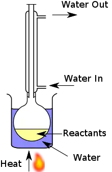 Many reactions require heat to increase reaction speed.[18] However, in many situations increased heat can cause the solvent to boil uncontrollably which negatively affects the reaction, and can potentially reduce product yield. To address this issue, reflux condensers can be fitted to reaction glassware. Reflux condensers are specially calibrated pieces of glassware that possess two inlets for water to run in and out through the glass against gravity. This flow of water cools any escaping substrate and condenses it back into the reaction flask to continue reacting[19] and ensure that all product is contained. The use of reflux condensers is an important technique within organic syntheses and is utilized in reflux steps, as well as recrystallization steps.