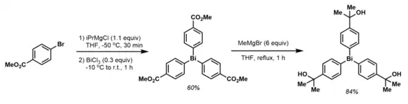 The most general and widely used methodology for the synthesis of homoleptic trialkyl- and triarylbismuth complexes is the reaction of BiX3 with organolithium or magnesium reagents generally of the form of a Grignard reagent:[6]