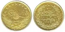 The pound or lira (sign: LT; Ottoman Turkish: ليرا, romanized: līrā, French: livre turque, Greek: οθωμανική λίρα, romanized: othomanikí líra, Armenian: Օսմանյան լիրա, romanized: Osmanyan lira, Arabic: ليرة عثمانية, romanized: līra, lēra ʕuṯmāniyya) was the currency of the Ottoman Empire from 1844[1] until 1927, when it was replaced by the Turkish lira. The Ottoman lira remained in circulation until the end of 1927, as the republic was not in a position to issue its own banknotes yet in its early years.[2]