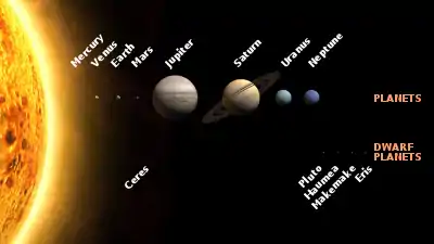 Solar System – gravitationally bound system comprising the Sun and the objects that orbit it, either directly or indirectly. Of those objects that orbit the Sun directly, the largest eight are the planets (including Earth), with the remainder being significantly smaller objects, such as dwarf planets and small Solar System bodies. Of the objects that orbit the Sun indirectly, the moons, two are larger than the smallest planet, Mercury.