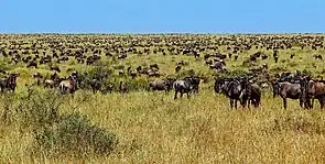 Overgrazing reduces the usefulness, productivity and biodiversity of the land and is one cause of desertification and erosion. Overgrazing is also seen as a cause of the spread of invasive species of non-native plants and of weeds. Degrading land, emissions from animal agriculture and reducing the biomass in a ecosystem contribute directly to climate change[2] between grazing events. Successful planned grazing strategies have been in support of the American bison of the Great Plains,[3][4] or migratory wildebeest of the African savannas,[5] or by holistic planned grazing.[6]
