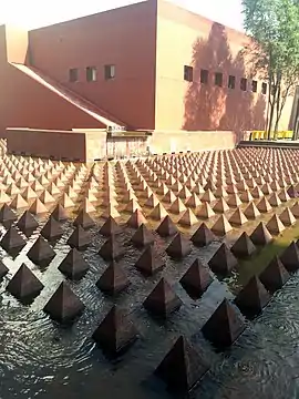País de volcanes (lit. transl. Country of Volcanoes) is an outdoor fountain and sculpture by the Spanish-born Mexican artist Vicente Rojo Almazán, installed outside Mexico City's Secretariat of Foreign Affairs Building and next to the Memory and Tolerance Museum, in Mexico.[2] It is a 1,000 square meters (11,000 sq ft) artwork[3] that features 1,034 ocher-colored pyramids standing out of the water;[4] the artwork was made with tezontle, a type of reddish volcanic rock. The central body of the fountain contains water that flows subtly down its sides to the area with the pyramids.[5] For Jaime Moreno Villarreal of Letras Libres, the fountain is located slightly below the square level so that the viewer can appreciate the volcanic geography.[2]