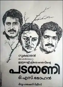 Padayani is a 1986 Indian Malayalam-language thriller film written and directed by T. S. Mohan and produced by Sukumaran. It stars Mohanlal, Mammootty, Shobhana and Devan. The film features music composed by A. T. Ummer.[1][2] Ramesh, Sudhakaran and Rajasekharan are long-lost friends, who reunite to take revenge against the evildoer in their lives. The film was the debut of Indrajith Sukumaran, who plays the younger version of Ramesh (Mohanlal).