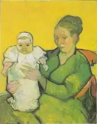 Marcelle Roulin, the youngest child, was born on 31 July 1888, and four months old, when Van Gogh made her portraits.[20] She was painted three times by herself and twice on her mother’s lap.[17] The three works show the same head and shoulders image of Marcelle with her chubby cheeks and arms against a green background.[21] When Johanna van Gogh, pregnant at the time, saw the painting, she wrote: "I like to imagine that ours will be just as strong, just as beautiful – and that his uncle will one day paint his portrait!"[17] A version titled Roulin's Baby resides at the National Gallery of Art in Washington, D.C.[22]
