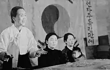 She was the first chairperson of the North Korean Central Committee of the Korean Democratic Women's League.[3] During her tenure, lasting from the 1940s to 1965,[9] the league was a typical women's mass organization not unlike those in other countries. It was only under subsequent chairpersons that it acquired more totalitarian features.[4] Pak also played a leading role in the Women's International Democratic Federation (WIDF).[19] She was a member of its executive committee in 1948. In 1951, a WIDF International Commission of Women visited North Korea on her initiative to mobilize the world public opinion.[20] She received the International Stalin Prize in 1950 and also starred in Joris Ivens and Jerzy Bossak's anti-war documentary film Peace Will Win.[21][22] She has also revived the North Korean Order of the National Flag, both first and second class.[1]