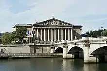 The Palais Bourbon (pronounced [pa.lɛ buʁ.bɔ̃]) is the meeting place of the National Assembly, the lower legislative chamber of the French Parliament. It is located in the 7th arrondissement of Paris, on the Rive Gauche of the Seine, across from the Place de la Concorde.