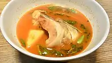 Spices are also generally included although not as liberally as its same-island counterpart. Palembang cuisine is noted by its preference to the sour and sweet flavour,[3] as evidences in pindang fish soup, funky-smelled tempoyak-based dish made from fermented durian, and also kuah cuko spicy sweet vinegar sauce of pempek fishcake. Those dishes are popular fare and often associated with the city.[4]