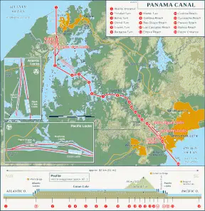 A schematic of the Panama Canal, illustrating the sequence of locks and passages