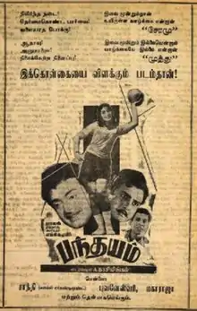 Pandhayam (transl.Bet) is a 1967 Indian Tamil-language film produced and directed by A. Kasilingam, who also wrote the screenplay from a story by Madurai Thirumaran. The film stars Gemini Ganesan and Vijaya Nirmala. It was released on 29 September 1967. The film was remade in Hindi as Sachaai (1969) and in Telugu as Manchi Mitrulu.[2]