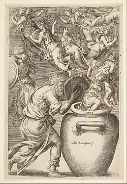 The etching by Sébastien Le Clerc that accompanied the poem in the book shows Pandora and Epimetheus seated on either side of a jar from which clouds of smoke emerge, carrying up the escaping evils. The lid of the jar is quite plainly in Epimetheus' hand.[35] Paolo Farinati, an earlier Venetian artist, was also responsible for a print which laid the blame on Epimetheus, depicting him as lifting the lid from the jar that Pandora is holding. Out of it boils a cloud which carries up a man and a dragon; between them they support a scroll reading "sero nimirum sapere caepit" (finding out too late), in reference to the meaning of Epimetheus' name in Greek.