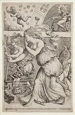 Another Venetian print, ascribed to Marco Angelo del Moro (active 1565 – 1586), is much more enigmatic. Usually titled "Pandora's Box, or The Sciences that Illuminate the Human Spirit", it portrays a woman in antique dress opening an ornate coffer from which spill books, manuscripts, snakes and bats. By Pandora's side is a woman carrying a burning brand, while a horned figure flees in the opposite direction. Above is a curved vault painted with signs of the zodiac to which the sun-god Apollo is pointing, while opposite him another figure falls through the stars. Commentators ascribe different meanings to these symbols as contradictory as the contents of the chest. In one reading, the hand Pandora holds up to her face makes her the figure of Ignorance.[36] Alternatively her eyes are protected because she is dazzled and the snakes crawling from the chest are ancient symbols of wisdom.[37] Apollo, seated above, points to Aquarius, the zodiacal sign of January/February, which marks the "Ascent of the Sun" from the trough of winter. The falling figure opposite him may be identified either as Lucifer or as night fleeing before the dawn; in either case, the darkness of ignorance is about to be dispelled. The question remains whether the box thus opened will in the end be recognised as a blessing; whether the ambiguous nature of knowledge is either to help or to hurt.