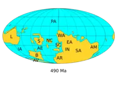 ![]() Paleogeography of Earth in the late Cambrian, around 490 Ma |