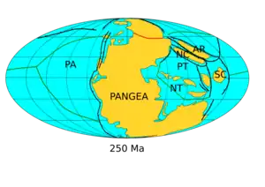 ![]() Paleogeography of the Earth at the Permian–Triassic boundary, around 250 Ma. Siberia has fused with Pangaea to complete the assembly of the supercontinent. |