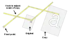 In 1603,[2] Christoph Scheiner used a pantograph to copy and scale diagrams, and wrote about the invention over 27 years later, in "Pantographice seu Ars delineandi res quaslibet per parallelogrammum lineare seu cavum" (Rome 1631). One arm of the pantograph contained a small pointer, while the other held a drawing implement, and by moving the pointer over a diagram, a copy of the diagram was drawn on another piece of paper. By changing the positions of the arms in the linkage between the pointer arm and drawing arm, the scale of the image produced can be changed.
