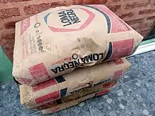 A paper sack is a type of paper bag that can be constructed of one or several layers of high quality kraft paper, usually produced from virgin fibre. Paper sacks can also be referred to as industrial paper bags, industrial paper sacks, shipping sacks or multi-wall paper bags or sacks. They are often used for packaging and transporting dry powdery and granulated materials such as fertilizer, animal feed, sand, dry chemicals, flour and cement. Many have several layers of sack papers, printed external layer and inner plies.[12] Some paper sacks have a plastic film, foil, or polyethylene coated paper layer in between as a water-repellant, insect resistant, or rodent barrier.