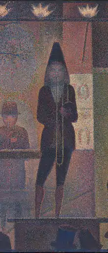 Circus Sideshow is a large oil painting on canvas measuring 99.7 × 149.9 centimetres (39.3 × 59.0 in). Painted in the Divisionist style, the work employs pointillist dots of color (primarily violet-gray, blue-gray, orange, and green) and a play of lines governed by rules whose laws Seurat had studied.[4] It depicts immobile figures outdoors under artificial lighting at the sideshow of the Circus Corvi at place de la Nation, a working-class quarter in eastern Paris.[5] A row of cornet and trombone players in solemn formation are seen under the unreal evening lights of a parade. The work is dominated by a monotony of horizontal and vertical lines, suggesting the rhythms of Egyptian reliefs and frescoes.[2][5][6] Though rather than indicating distance as Egyptian art (by changing scale), or classically (by foreshortening), Seurat establishes the position of his subjects through lighting. Those in the foreground are unlit, painted in dark blue, while those behind the gas jets are brilliantly lit.[5]