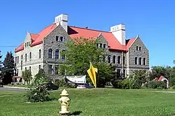 White's Romanesque Revival three-story structure featured a small central circular building, two rectangular wings, and an eight-story, four-faced clock tower.[10] Construction on the building, located at 1400 First Avenue North, began in 1894. The high school was built of gray sandstone obtained from quarries near both Helena and Great Falls.[10][11] The walls, which were 5 feet (1.5 m) thick at the bottom of the building but only 4 feet (1.2 m) thick at the roof, were sunk 16 feet (4.9 m) into the earth and stood on shale bedrock.[10] To compact the foundation's backfill, a herd of sheep was driven around the structure 100 times.[10][11] Wood for the interior supports, roof, and steps were cut from massive trees logged in the Rocky Mountains and floated down the Missouri River.[10][11]