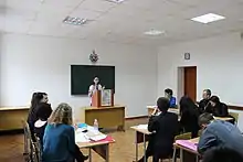 Debating in Khmelnytskyi, Ukraine. The Deputy Leader of the Opposition is speaking.