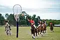 In modern pato, two four-member teams[5] riding on horses fight for possession of a ball which has six conveniently-sized handles, and score by throwing the ball through a vertically positioned ring (as opposed to the horizontal rim used in basketball). The rings have a 100 cm (3.3 ft) diameter, and are located atop 240 cm (7.9 ft) high poles. A closed net, extending for 140 cm (4.6 ft), holds the ball after goals are scored.