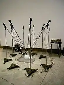 A conceptual art piece, first produced in 1970.[24] The work includes 10 boom microphones plugged into an active sound system recorded the sound of 25 pound blocks of ice melting in a metal pan on the floor.[24] The photographic image of the installation has an absurdity about it.[22] It asks the question, "what does ice sound like as it melts?"[25]