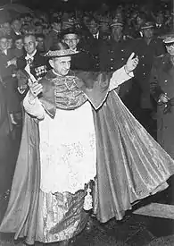 Pius XII delivered an address about Montini's appointment from his sick-bed over radio to those assembled in St. Peter's Basilica on 12 December 1954.[41] Both Montini and the Pope had tears in their eyes when Montini parted for his diocese, with its 1,000 churches, 2,500 priests and 3,500,000 souls.[42] On 5 January 1955, Montini formally took possession of his Cathedral of Milan. After a period of settling in, Montini liked his new tasks as archbishop, connecting to all groups of faithful in Milan. He enjoyed meetings with intellectuals, artists and writers.[43]