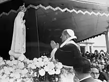 At the request of the Pope, Montini created an information office regarding prisoners of war and refugees, which from 1939 until 1947 received almost ten million requests for information about missing persons and produced over eleven million replies.[33] Montini was several times attacked by Benito Mussolini's government for meddling in politics, but the Holy See consistently defended him.[34] When Maglione died in 1944, Pius XII appointed Tardini and Montini together as joint heads of Secretariat of State, each with the title of Pro-Secretary of State. Montini's admiration was almost filial when he described Pope Pius XII: