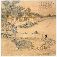 A peasant is a pre-industrial agricultural laborer or a farmer with limited land-ownership, especially one living in the Middle Ages under feudalism and paying rent, tax, fees, or services to a landlord.[1][2] In Europe, three classes of peasants existed: non-free slaves, semi-free serfs, and free tenants. Peasants might hold title to land outright (fee simple), or by any of several forms of land tenure, among them socage, quit-rent, leasehold, and copyhold.[3]