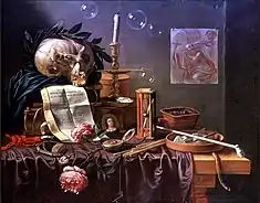 Sion is also known for a few vanitas still lifes, a genre of still lifes which offers a reflection on the meaninglessness of earthly life and the transient nature of all earthly goods and pursuits. The best known of these is the Vanitas still life with skull (At art dealer Bernheimer-Colnaghi, Munich/London) where the typical symbols of vanitas appear: a skull with a laurel crown, soap bubbles, an extinguished candle, an hour glass, a watch, a portrait of a woman, a wilted flower, books, cold cinders in a pot and an empty pipe. These objects all reference the transience of things and, in particular, of earthly wealth, status and learning. On a paper resting against the books and pinned by the skull are written the words from Ecclesiastes 7:36 Memorare novissima, et in aeternum non peccabis (Whatever you do, remember that some day you must die. As long as you keep this in mind, you will never sin).[7] A drawing on the wall depicts Saint Jerome, the Christian saint who had chosen an ascetic life over a life of indulgence in Rome. The saint is often depicted in paintings in his study with a skull.[8]