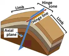 Model of anticline. Oldest beds are in the center and youngest on the outside. The axial plane intersects the center angle of bend. The hinge line follows the line of greatest bend, where the axial plane intersects the outside of the fold.