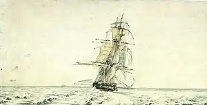 Construction of Iphigenia was cancelled on 26 July 1805, but reinstated on 20 January 1806. The ship was commissioned in May 1808 by Captain Henry Lambert, under whom Iphigenia sailed to the Cape of Good Hope Station on 28 January 1809.[32] As such she participated in the successful invasion of Île Bonaparte on 8 July 1810,[64] but was subsequently captured by the French at the battle of Grand Port on 28 August.[65] The French took Iphigenia into service as Iphigénie, and on 6 December she was recaptured by the British at the invasion of Isle de France.[32][66] Captain Thomas Caulfield was given command of Iphigenia to sail her home, and the ship was paid off in April 1811. She received a refit at Portsmouth between November 1811 and February 1812, and was recommissioned in January of the latter year by Captain Lucius Curtis.[32]