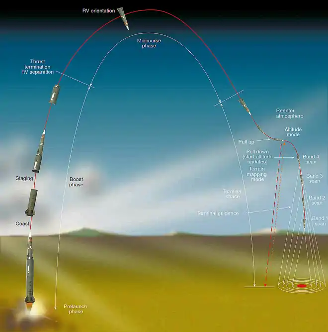 The highly accurate terminal guidance technique used by the Pershing II RV was radar area correlation, using a Goodyear Aerospace active radar homing system.[9] This technique compared live radar video return to pre-stored reference scenes of the target area and determined RV position errors with respect to its trajectory and target location. These position errors updated the inertial guidance system, which in turn sent commands to the vane control system to guide the RV to the target.