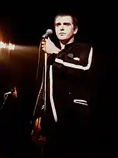 During a stop in Cleveland, Ohio, early into the album's tour, Gabriel informed the band of his intention to leave at its conclusion.[30] Music critics often focused their reviews on Gabriel's theatrics and took the band's musical performance as secondary, which irritated the rest of the band.[31] The tour ended in May 1975, after which Gabriel wrote a piece for the press on 15 August, entitled "Out, Angels Out", about his departure, his disillusion with the business, and his desire to spend time with his family.[32] The news stunned fans of the group and left commentators wondering if the band could survive without him.[33][34] His exit resulted in drummer Phil Collins reluctantly taking over on lead vocals after 400 singers were fruitlessly auditioned.