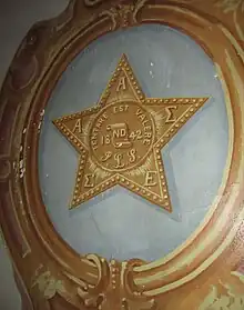 The Philomathean Hall is the oldest building[24] in the Erskine College-Due West Historic District. As such, it is a contributing property in the National Register of Historic Places.[25] It was constructed in 1859, under the direction of architect Thomas Veal. The building was constructed in the Italian Renaissance Revival style. The two-story stuccoed building features Corinthian pilasters, a pedimented pavilion, recessed balustrades and a Palladian window.[26] The Hall demonstrates the influence of Andrea Palladio as it bears close resemblance to the Villa Capra "La Rotonda" and the Villa Porto (Vivaro di Dueville). Palladio's geometrically formulaic design is echoed in the Philomathean Hall's 50x40 footprint, symmetrically placed windows and interior floor plan that conforms to the windows exterior placement. The open second floor meeting hall celebrates this geometry with its painted high ceiling, flanking fireplaces, and 14 symmetrically placed windows, while the downstairs rooms are dimensioned to match the window placement, a schematic that still challenges contemporary architects. The architectural similarities between the Hall and colonial American buildings, such as those at Mount Vernon, Monticello, and the White House, are thematic of the early 19th century.[27] Additionally, the Hall is aesthetically tied to other South Carolina buildings. It possesses characteristics similar to those found in Hibernian Hall and Drayton Hall. Leaks in the internal gutter have caused significant damage to the jewel-box painting on the ceiling of the great hall on the second floor, which was added in the 1912 J.J. Darlington renovation.[28][29] The ceiling and wall frescoes were painted by Italian painter Alfredo Lanzer.