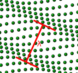 Due to the connections between atoms, the displacement of one or more atoms from their equilibrium positions gives rise to a set of vibration waves propagating through the lattice. One such wave is shown in the figure to the right. The amplitude of the wave is given by the displacements of the atoms from their equilibrium positions. The wavelength λ is marked.